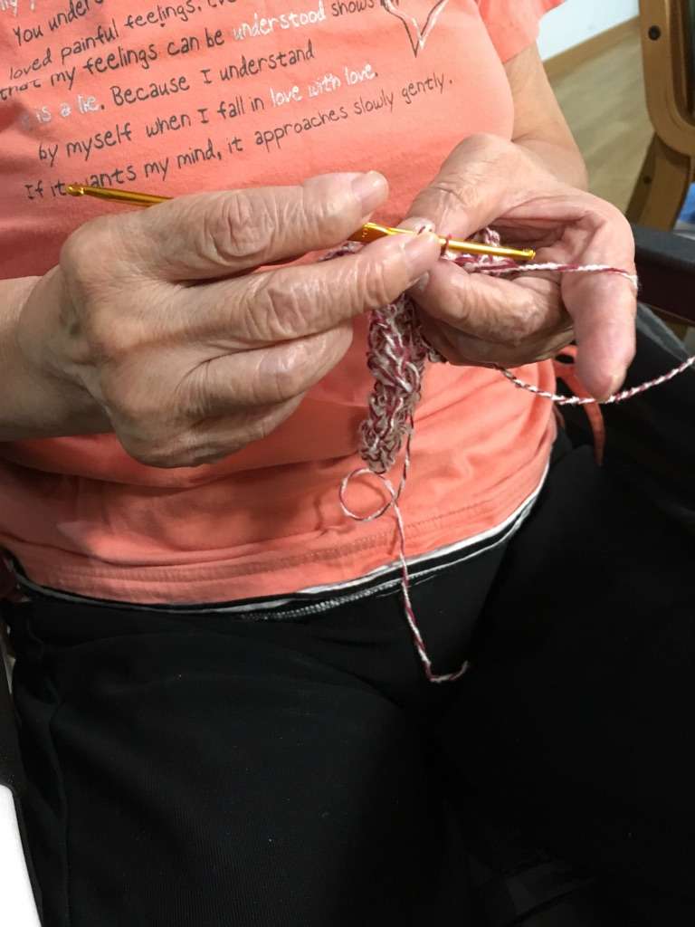 Y様は、黙々と編み物を続けるT様の手元を見ながら、