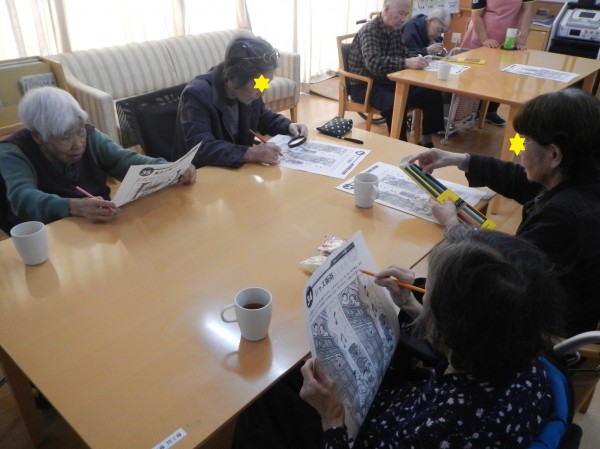 間違い探しの様子を配られると、「あ~難しそう・・・」「どこが違うの?」と不安気な反応がある中、黙々と左右のイラストを見つめ、全集中で間違いを探す多くのご利用者様の姿がありました。