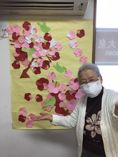 今月の壁画は丸く切った色画用紙を5枚組み合わせて梅の花を作り、