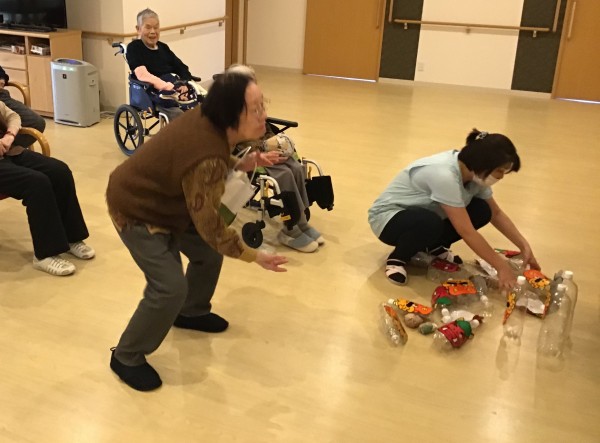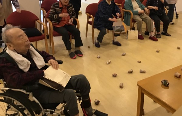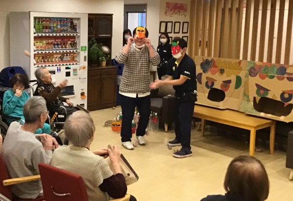 ケアスタッフも鬼役に手を挙げて、看護師に混ざって、皆様からの豆を浴びていました。