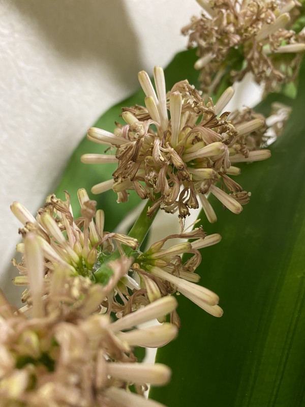 デイサービスの玄関先に置いてあった観葉植物に突然花?が咲きました( ゚Д゚)
