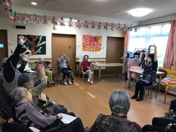 1階2階合同で体操を行ったり、入居者様の心身共に和やかに過ごしていただくような