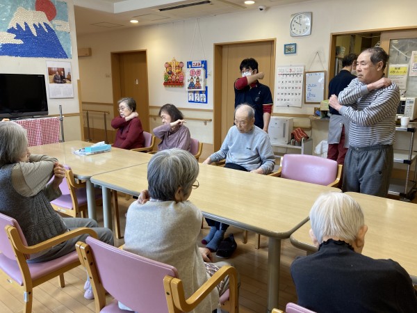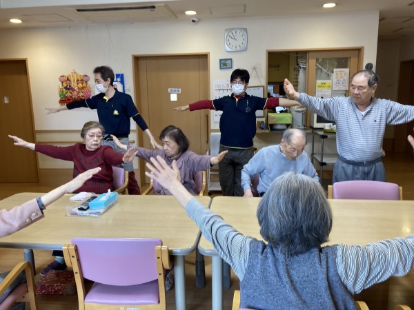 10時のお茶の時間の前にスタッフと皆さんで音楽に合わせて体操を行います。
