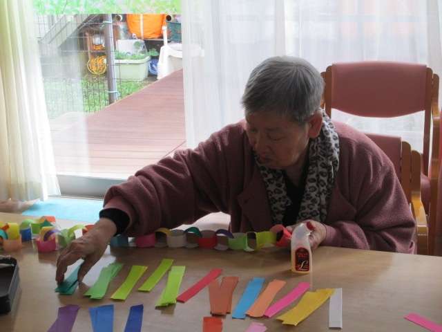 ![]() 短冊に切った折り紙をキレイに色分けして・・・ | ![]() 一つ一つ丁寧につなげていきます |