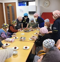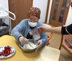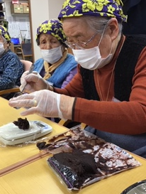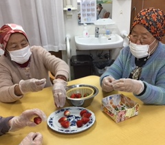 手にお餅をのせて、あんといちごを包む作業は皆様大苦戦!