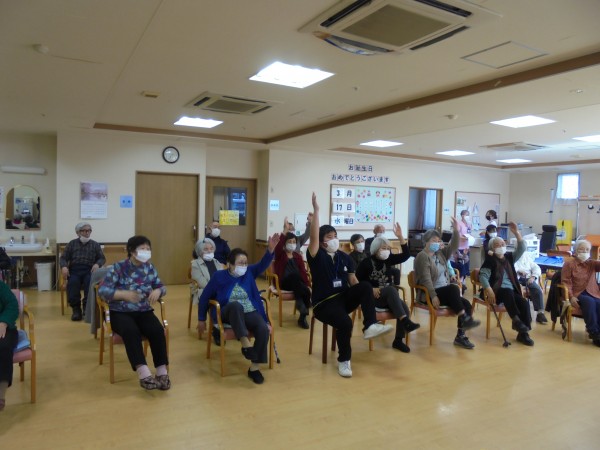 しばらく体操した後、テレビの向こうにいる高橋先生に呼ばれ職員の斉藤が先頭に立ち皆さんの前で動きました( *´艸`)