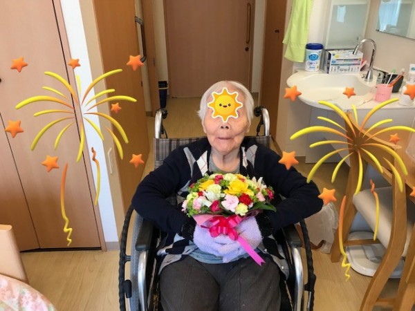 ご本人様はご家族様にお会いできた事、誕生日プレゼントの両方に喜ばれ、面会が終わった後、笑顔で職員に「花が好きなのを覚えてくれていて、プレゼントくれたから嬉しいね」とおっしゃっていました。
