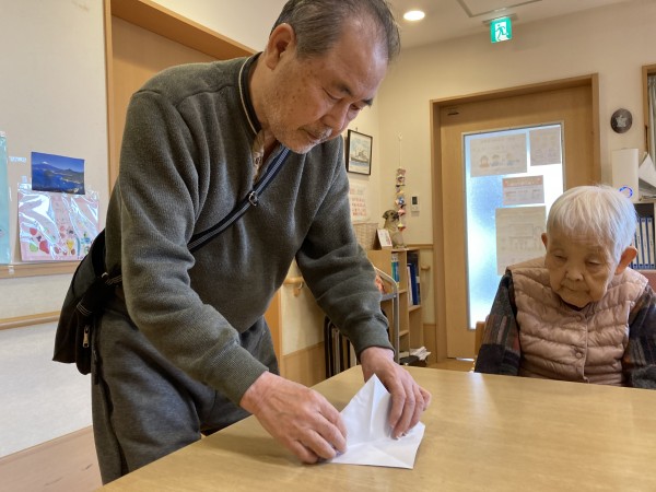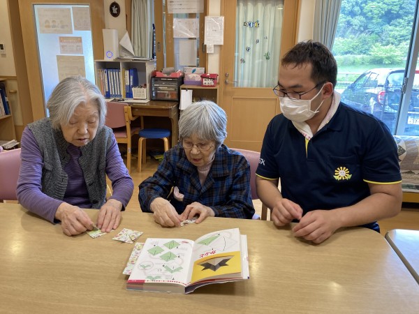 早いもので4月も後半ですね。今日はスタッフと一緒に折紙でカブトを作りました。