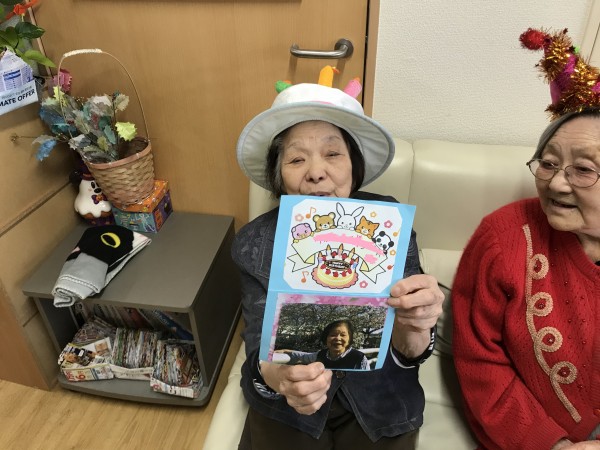 他のご利用者様や職員と一緒にハッピーバースデーの歌を歌い、 誕生日の方にカードのプレゼント♪