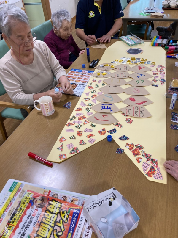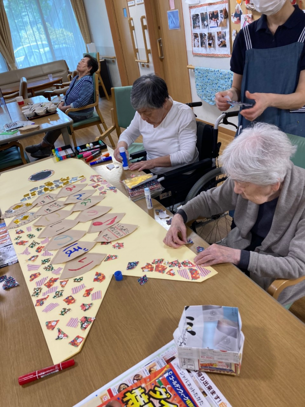 いつもと違う「大きな」、しかも「みんなの♪」こいのぼり作りの話が盛り上がったのは、4月22日でした。5月5日まであまり時間がありません。ですから、失敗は許されません(笑) そこで、「大きな」とはどれくらいの大きさがいい? 「みんなの♪」ってどうすればみんなの♪になる? などについて、入居されている皆様と意見を出し合い、出来上がりイメージをみんなで合わせるために、まずは試作品を作ってみることにしました。