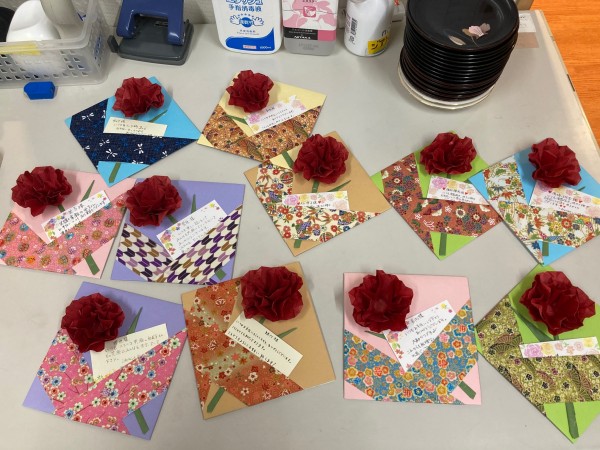 職員さんの折って下さったカーネーションにメッセージカードを入れさせて頂き
