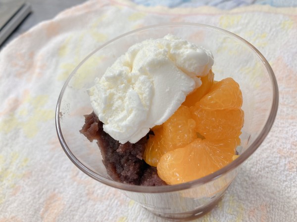 青菜の胡麻和え、すまし汁、デザートのあんみつはアイスクリームをのせて頂きます!