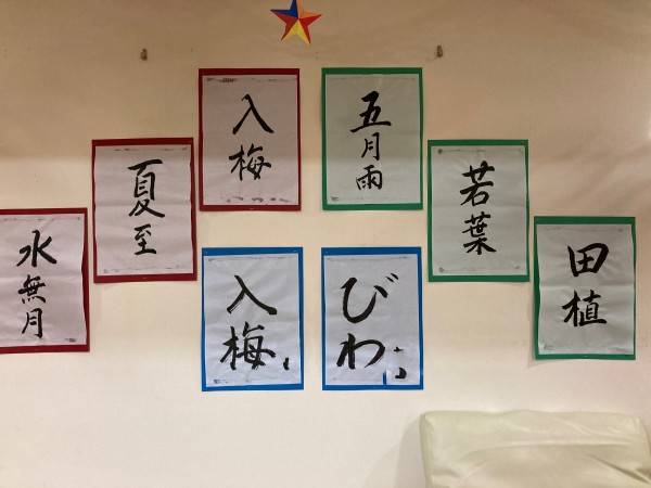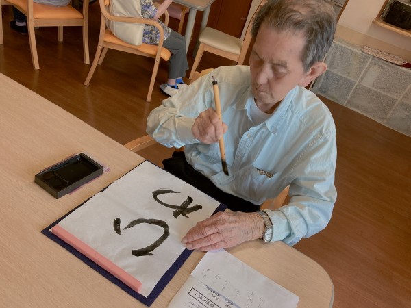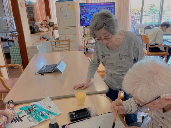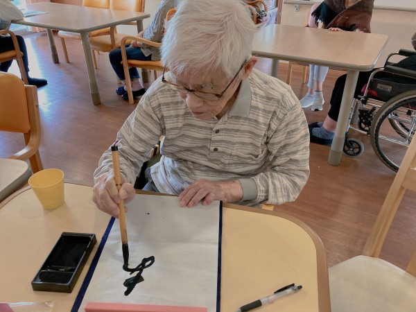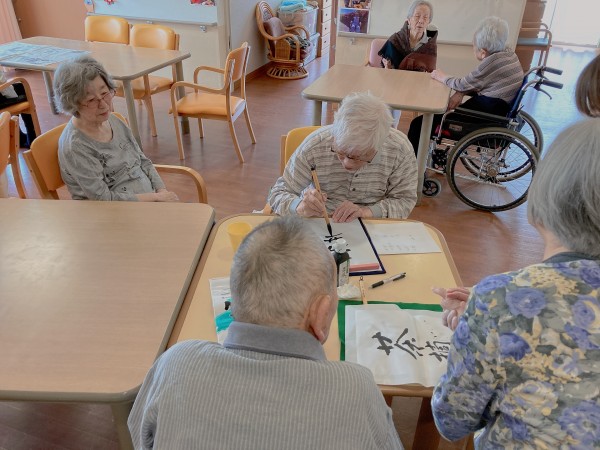 笑顔で筆を取り、季節の言葉を
