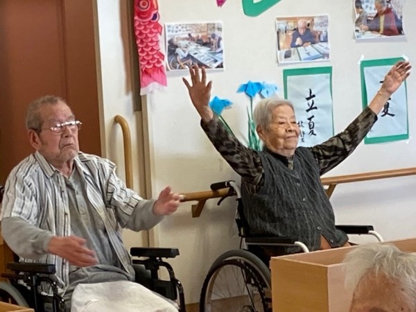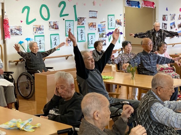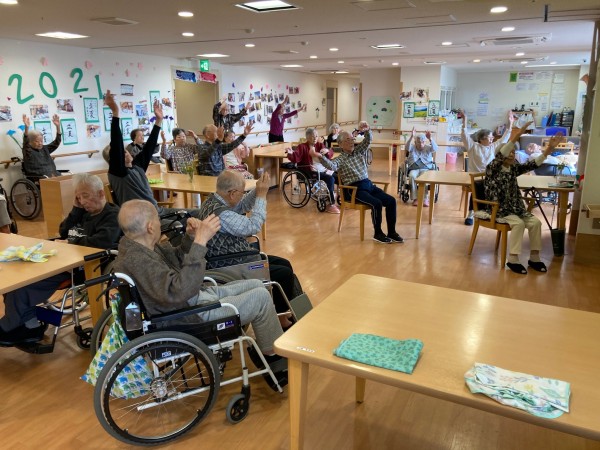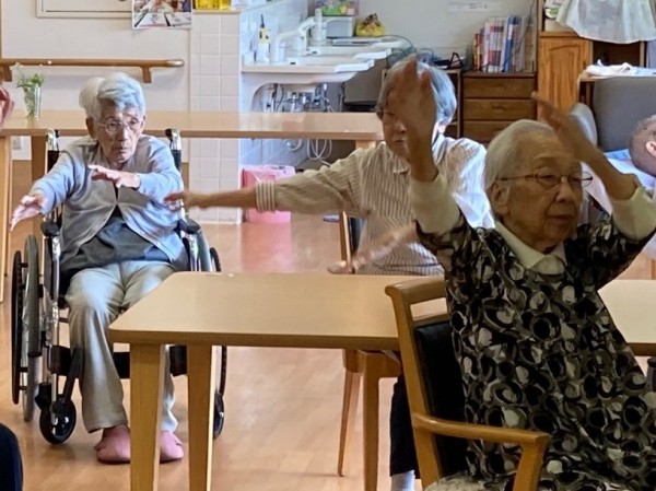 ALSOK介護株式会社では様々な健康増進コンテンツをご提供させていただき、毎日皆様に参加をしていただいておりますが、ラジオ体操だって毎日開催しておりますよ!音楽が流れると、皆様自然と身体が動きますね。