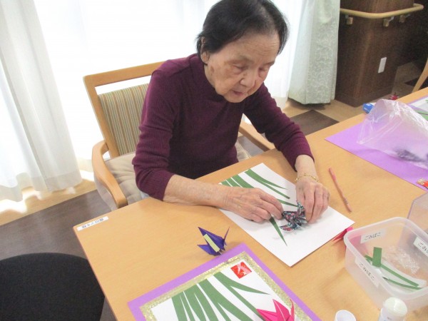 職員さんと綺麗な色紙であやめを折ります。