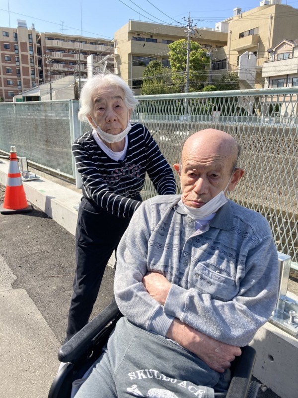 写真右(下):多摩川の支川を背に、やはり記念撮影!・・・ちょっとまぶしかったのでしょうか、お二人ともややこわばったをされていますが、散歩中は「おお、そうか。(そよ風が)気持ちいい~♪」「気持ちいね~♪」と会話がはずんでおられました(笑)