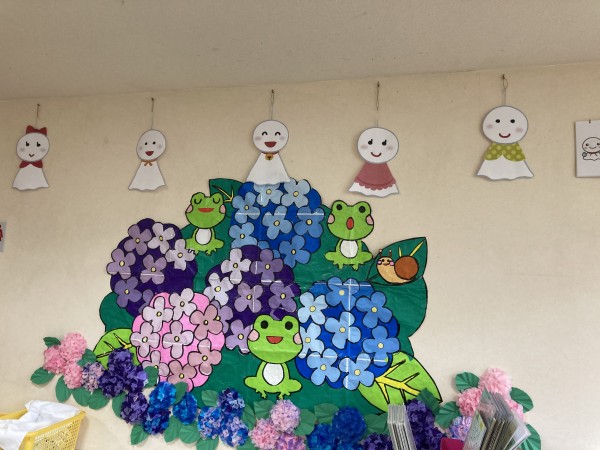 今月の貼り絵のテーマは6月ということで梅雨!カエルと一緒にてるてる坊主も合唱しています(^^♪