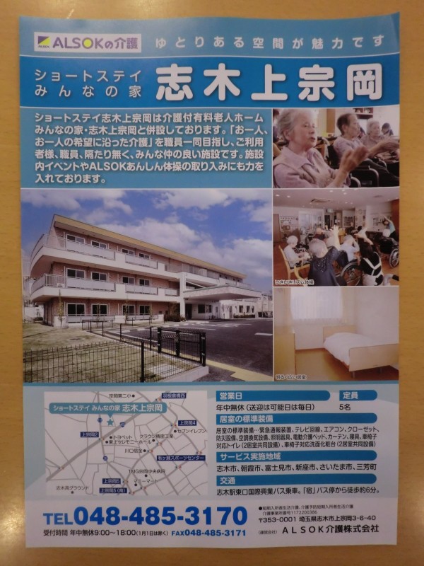 併設事業所である、ショートステイみんなの家志木上宗岡の新しいパンフレットが完成しました(^^)/