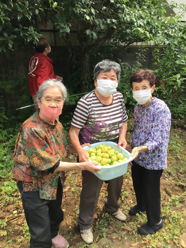 デイの庭に実った梅を、ご利用者様に手伝ってもらい収穫しました。