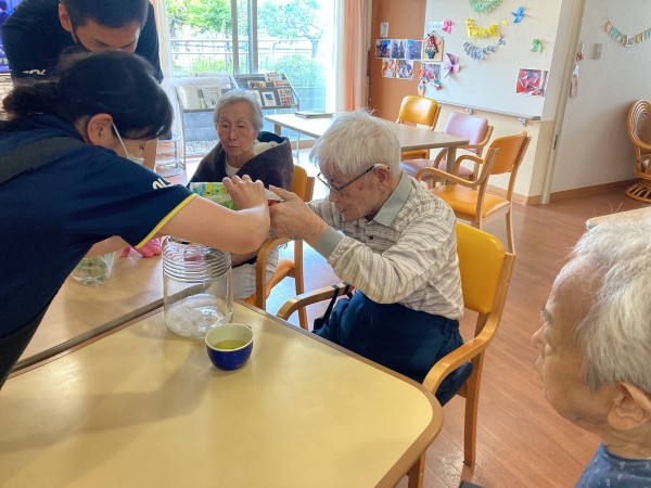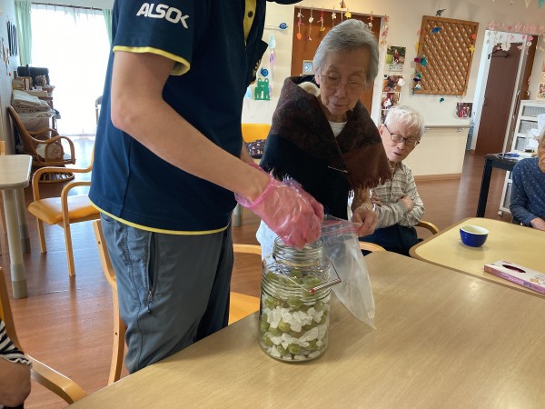 利用者様に机を囲んでもらい、順番に氷砂糖と梅を入れてもらいました!