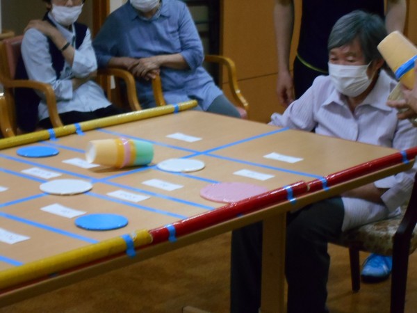 今日のレクリエーションは、ボールの入った紙コップを転がして点数を競うそーっとコロコロ!