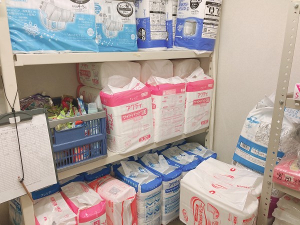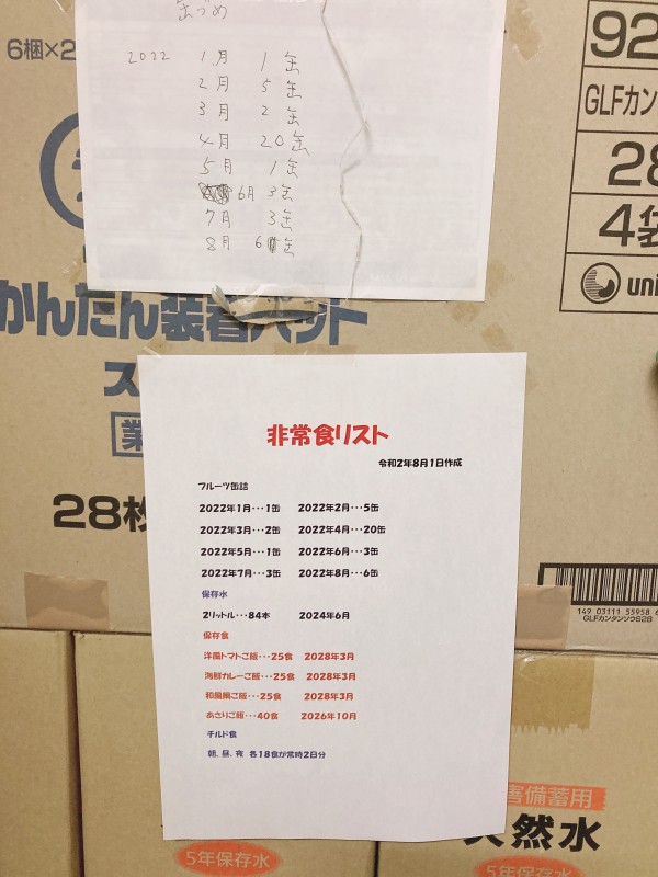 施設では水害用に2階に色々な備蓄品を用意して備えております。