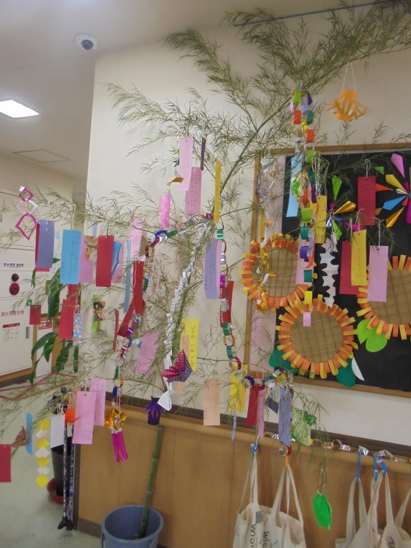 玄関とフロア入口にも七夕の笹に飾りつけも皆さんにやっていただき、短冊にお願いいことも書きました☆彡