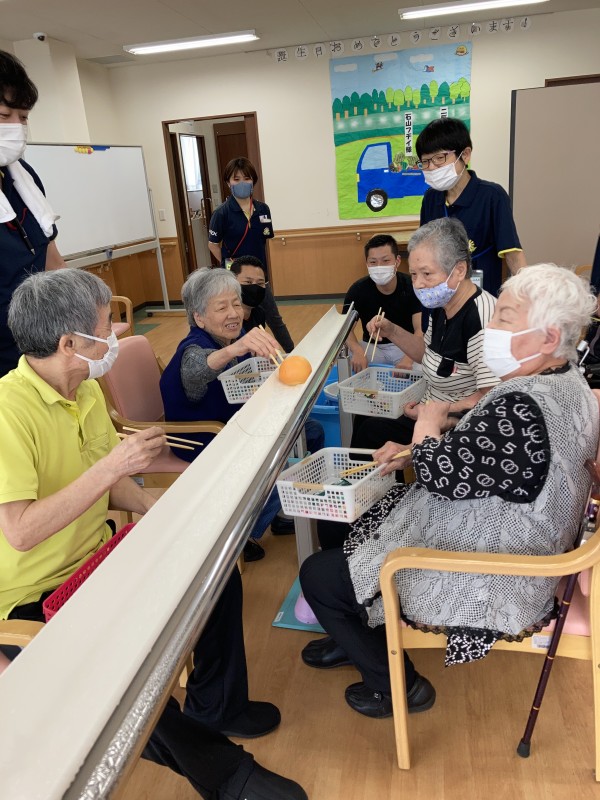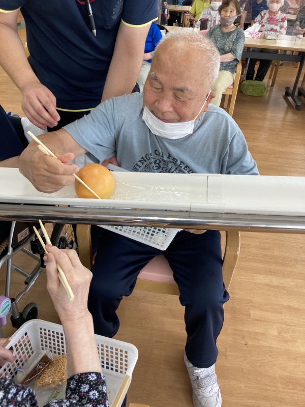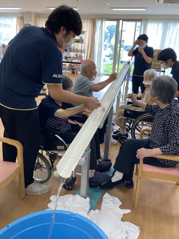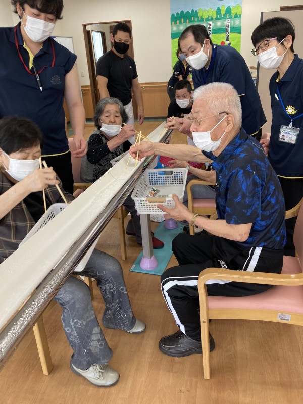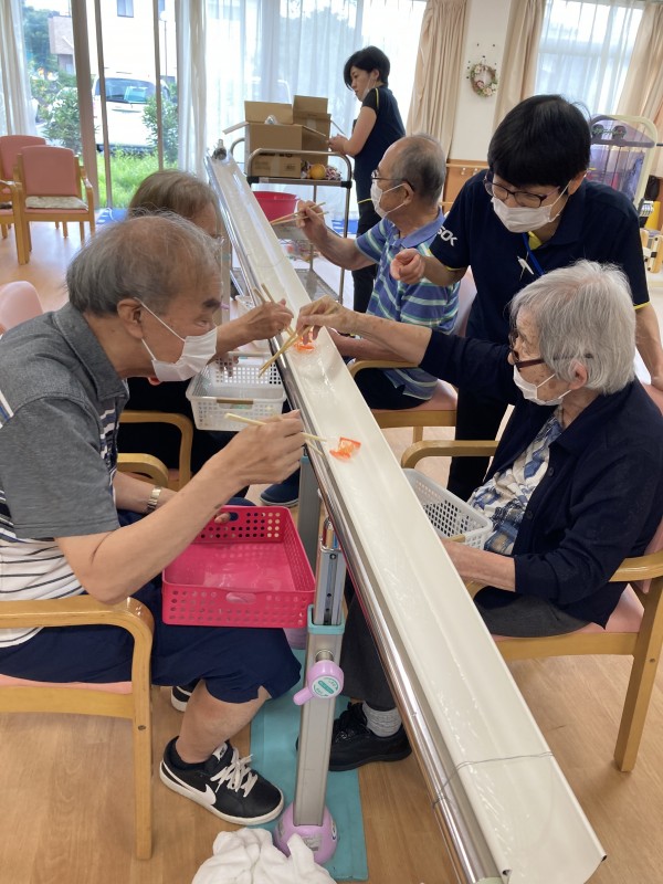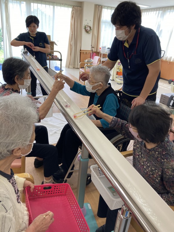 その後で、流しそうめん用のセットから、水でお菓子を流して、利用者様たちが箸で取る「うまいもの流し」を行いました。