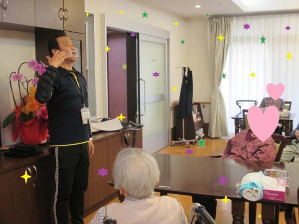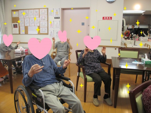 毎月定期的に健康体操のインストラクターが来て、皆様と一緒に体操を行います。体を動かし、リフレッシュし健康を維持する事が目的です。弊社健康増進課が独自で考えたNõA体操を行っている様子です。2つの事を同時に行うことにより認知症予防に効果があります。あちこちの体の部位を動かす体操で皆様にも好評です。