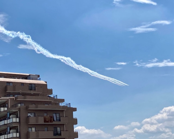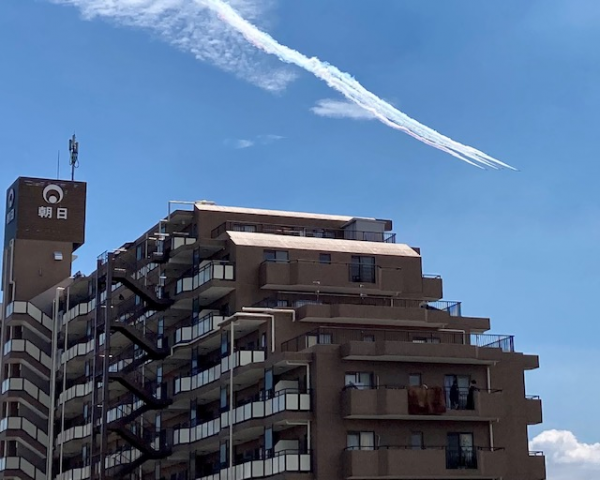 グループホームみんなの家・墨田では、屋上のわずかなスペースにご利用者4名ほどですが、上ってブルーインパルスを見ました。