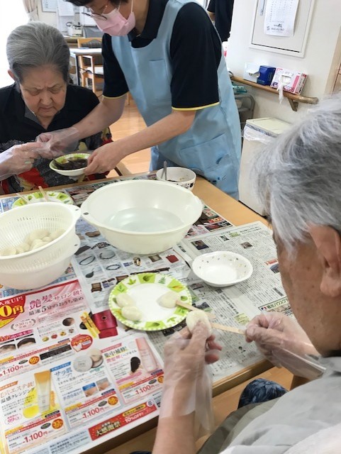 今日はおやつレクで白玉団子と水餅をご利用者様と一緒に