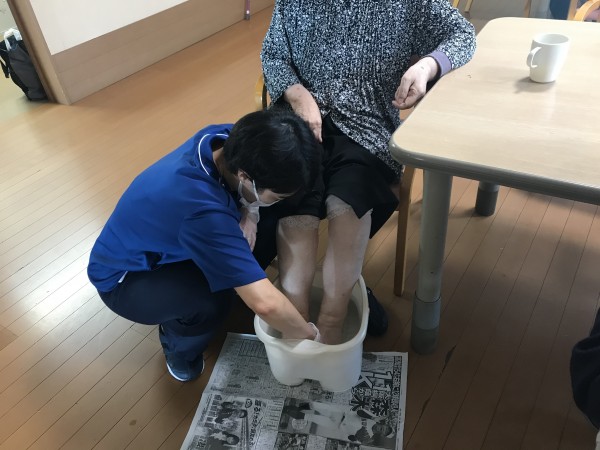 入居者様と会話をしながら日々の状況をお聞きしたり足湯をして足の爪を切ったり