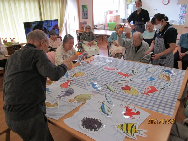 魚釣り大会の開催です! アジ、サンマ、サケ、いろいろな魚がたくさん泳いでおります。よく見るとサメ、クジラ、イルカ、ジンベイザメまでいますよ。本当にこんな魚が釣れるんでしょうか・・・・・・・?