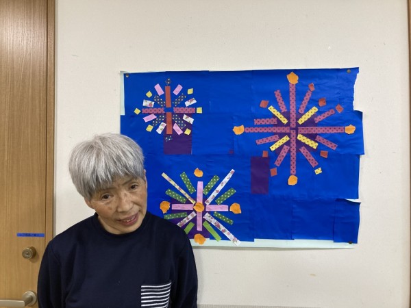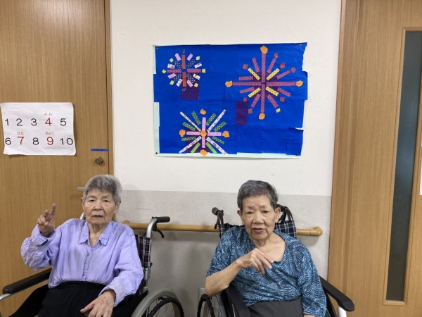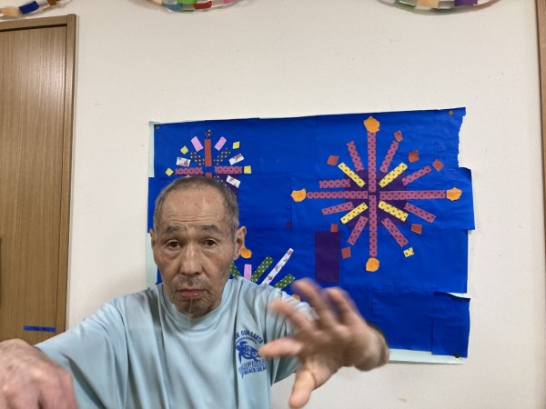 今回のレクレーションで、皆さんと一緒に折り紙で”花火”を作ってみました(^^♪