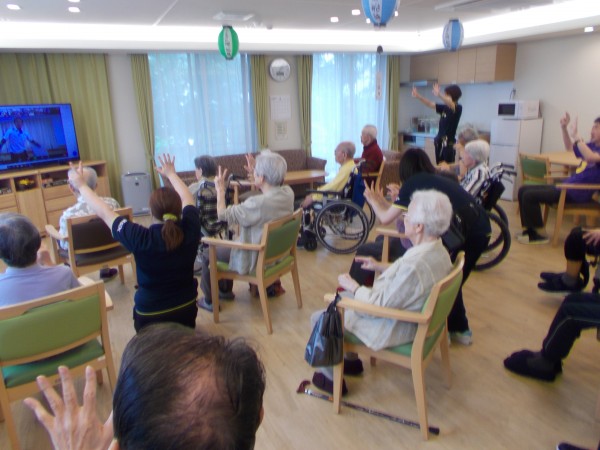 参加したスタッフは、お客様の間に入り体操の促しをしています。