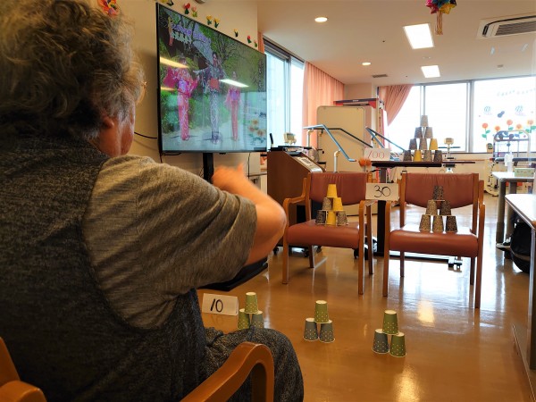 紙コップのタワーを作り、タワーめがけてお手玉を投げ、倒れたら得点ゲットです!