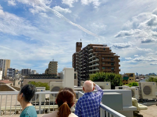 グループホームみんなの家・墨田では、小スペースの屋上にてパラリンピック前の予行演習の「ブルーインパルス」を見学しました。