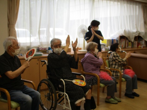 賑やかに楽しみながら体を動かしました。最後に『大東京音頭』を歌い、皆さん笑顔いっぱいで楽しまれていました。