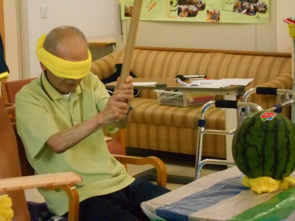 8月25日、スイカ割り大会を開催。参加された利用者様には目隠しをして頂き、丸々実ったスイカを相手に、割るか・外れるかの大勝負を楽しんでおられました。