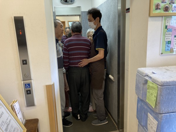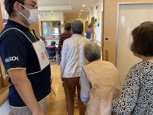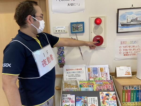 夜勤者が火災を発見し、皆様を外に誘導し避難しました。