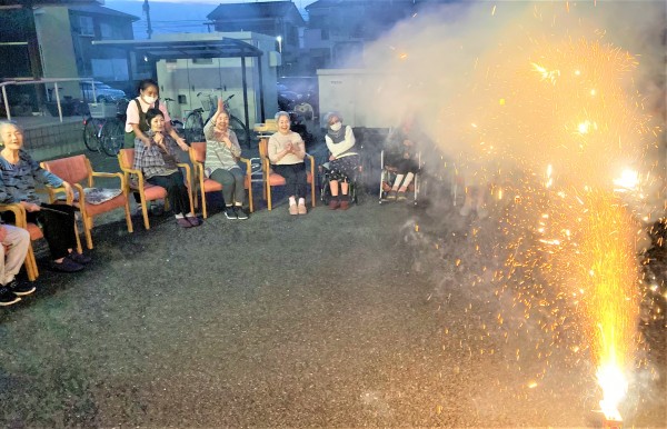 遅れて参加された最高齢98歳のW様も、締めの噴出花火が一番勢いに乗っているときに間に合いました。