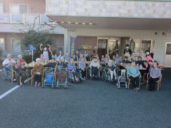事業所の駐車場スペースにテーブルを並べて全員、自己紹介をしました!