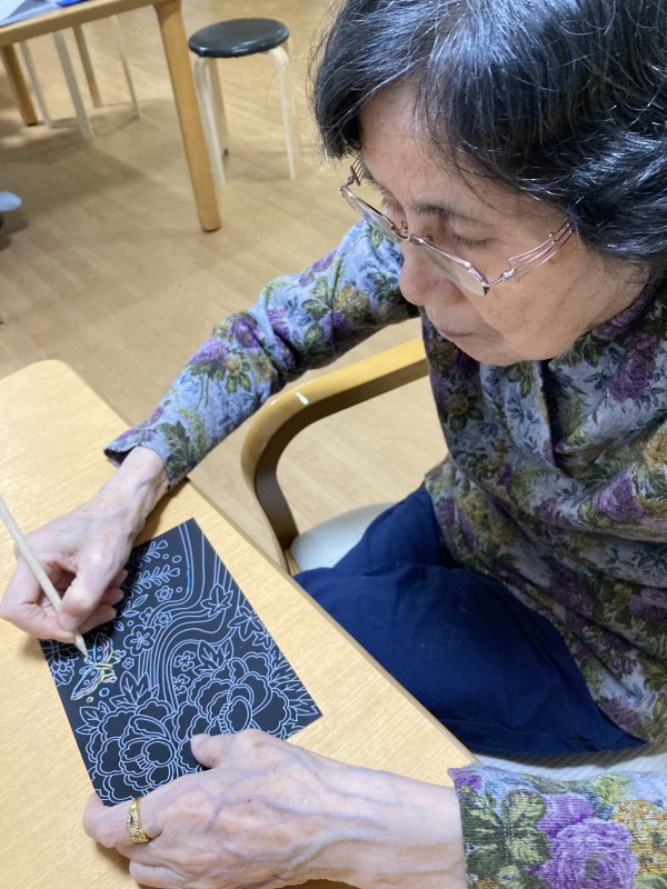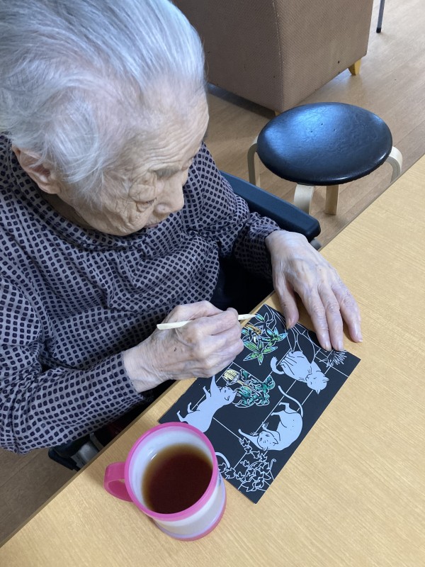 今日は、竹ぐしでなぞっていくときれいな色が出る塗り絵をしました。