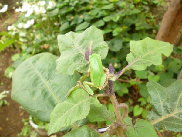 ナスの葉にカエルが、、、