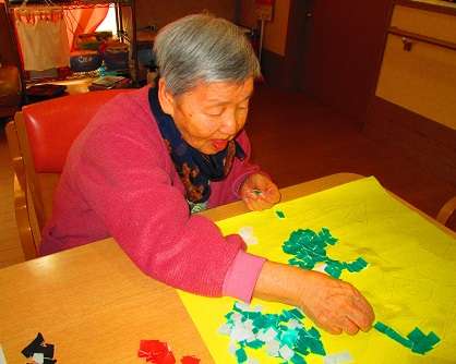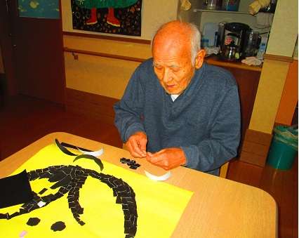 ![]() 赤い折り紙、緑の折り紙・・・ ちぎって貼って・・・ | ![]() 黒い折り紙も貼っていきます。 |