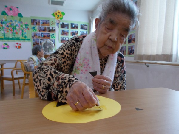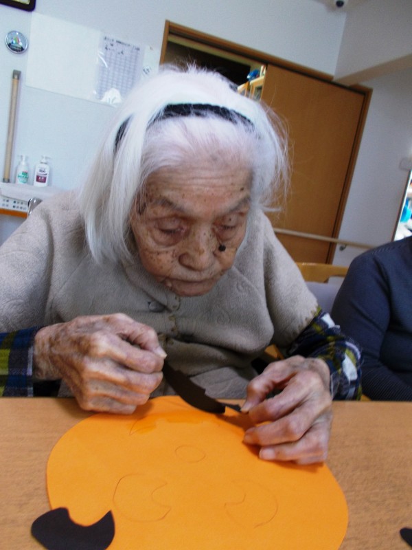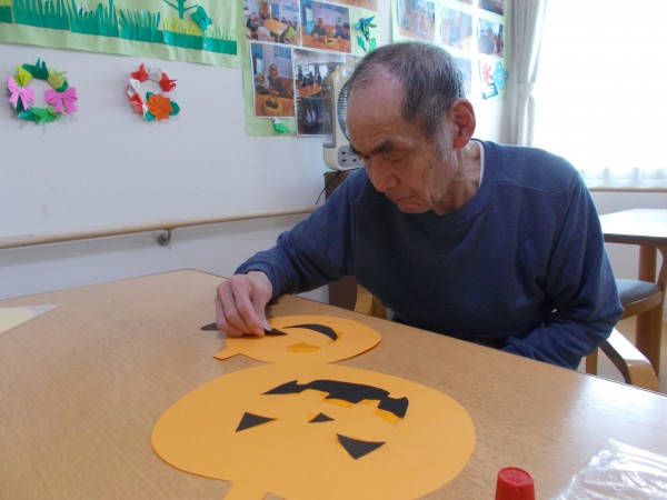 もうすぐハロウィンということで、みなさんとかぼちゃの壁飾りを作っています。