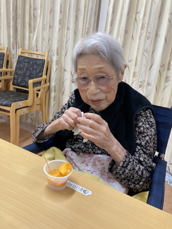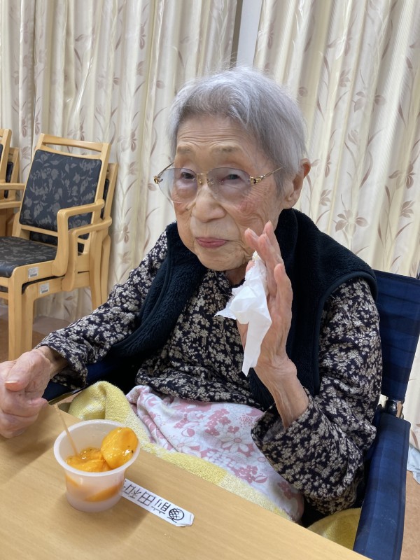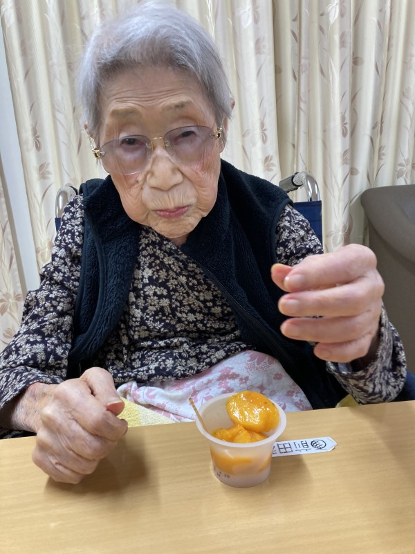 ご家族様がお母様に柿をお届けくださったのでお3時に召し上がっていただいた時のご様子です。おいしい柿を召し上がれ。