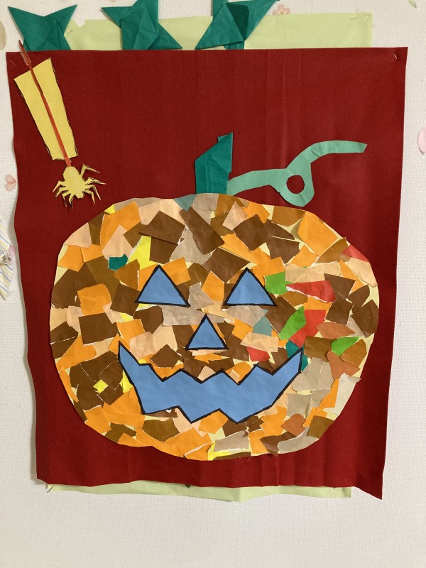みなさんと作っていたかぼちゃの貼り絵が完成しました。