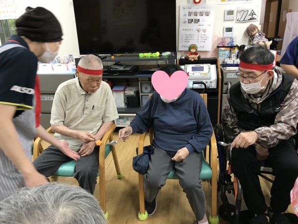 紅白に別れてスプーンでピンポン玉を運んでいます!