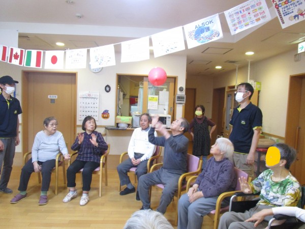準備体操を行い、最初の種目は風船投げです。落とさないように頑張りました♪
